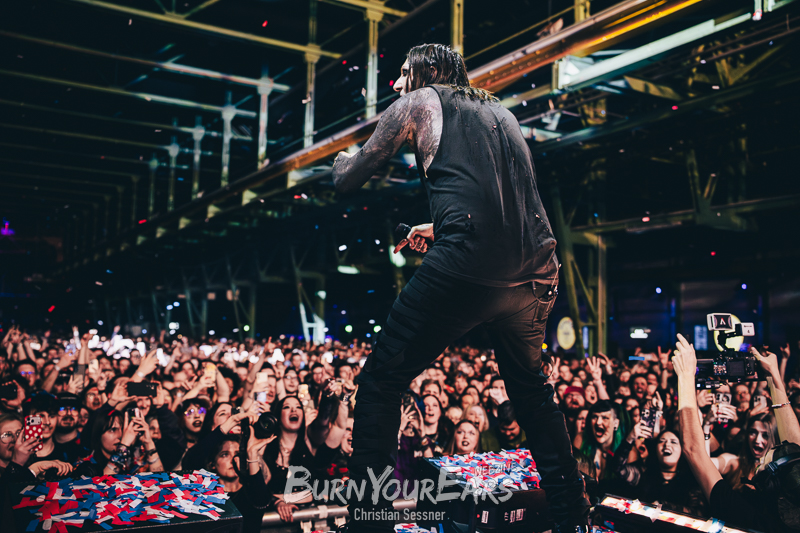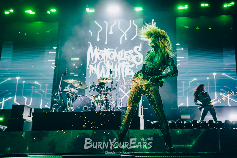 Nach der spektakulären Showeinlage gleich zu Beginn des Konzerts ließ es sich Sänger Chris Motionless nicht nehmen, kurz mit dem Publikum zu interagieren. Er heizte die Menge gezielt an, um im nächsten Moment mit „Sign Of Life“ das Programm weiter abzuspulen. Auch hier wurde wieder einiges geboten. Die CHERRY BOMBS kamen erneut mit auf die Bühne und sorgten mit passendem Equipment für beeindruckenden Funkenflug. Dabei hatte jede Darstellerin einen Winkelschleifer in der Hand, der in Verbindung mit einem Metalgürtel um die Hüften ordentlich Funken sprühen ließ.
